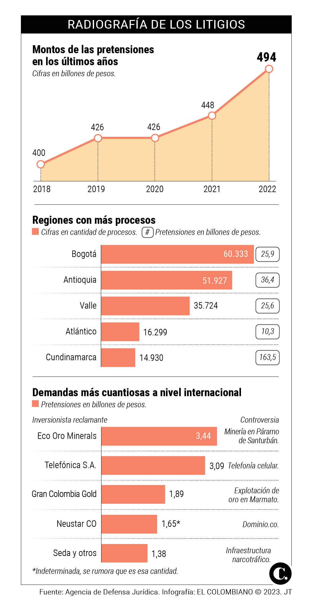 Según el más reciente informe de litigiosidad que divulga cada trimestre la Agencia, actualmente hay casi 367.000 procesos contra el Estado con pretensiones por $494 billones. A nivel local, el más cuantioso asciende a $35,6 billones y corresponde a una acción de grupo en la que se reclama una indebida actuación administrativa en Sampués (Sucre). En el municipio, reclaman, siguió operando la Secretaría de Tránsito, pese a que había sido suprimida.